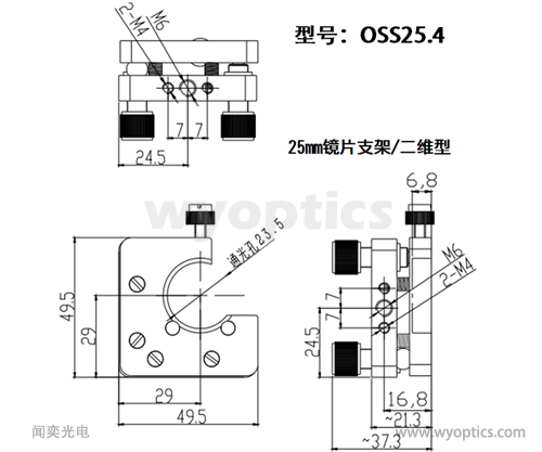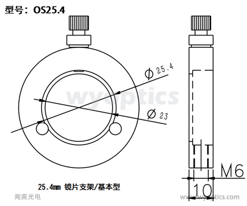 闻奕光电生产的 25.4mm 光学镜架可以安装25.4mm和25mm直径的镜片。其中OS-25.4为基本型;OSS-25.4为二维型,可以微调角度;均可以安装在光学支杆上。